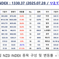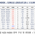언론 통합 플랫폼이자 인터넷신문사 제보팀장을 운영 중인 더에이아이미디어는 7월 29일 NZSI INDEX 기반 시황 보고서를 발표했다. [편집자주] NZSI INDEX는 왜곡된 시장 정보에서 벗어나, 개인 투자자를 위한 공정하고 실질적인 투자 기준을 제시합니다. NZSI INDEX에는 미래를 설계할 수 있는 자본시장의 가능성이 담겨 있습니다. ★ 지수변경 : 1,000을 기준으로 종목 기여도 동일 반영 ★ 기 준 가 : 2024. 12. 20 / 1차 개편 : 2025. 04. 01 ★ 평가기준 : 20개 종목 X 5개 항목 (건전성, 안전성, 성장성, 위험도, 기대값) X 10등급 (A3 ~ D) 2025년 7월 29일, 국내 증시 코스피 지수는 전 거래일보다 0.66% 오른 3,230.57포인트로 장을 마쳤다. 이로써 코스피는 5거래일 연속 상승세를 이어갔다. 코스닥 지수는 0.01% 상승한 804.45포인트로 마감되며 상승 전환했다. 이날 코스피 시장의 거래대금은 약 11조 원, 코스닥 시장은 약 6조 8천억 원으로 전일과 유사한 수준이었다. 시가총액은 각각 코스피 2,634조 원, 코스닥 413조 원으로 집계됐다. 글로벌 증시 다우존스 산업평균지수는