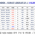 언론 통합 플랫폼이자 인터넷신문사 제보팀장을 운영 중인 더에이아이미디어는 7월 21일 NZSI INDEX 기반 시황 보고서를 발표했다. [편집자주] NZSI INDEX는 왜곡된 시장 정보에서 벗어나, 개인 투자자를 위한 공정하고 실질적인 투자 기준을 제시합니다. NZSI INDEX에는 미래를 설계할 수 있는 자본시장의 가능성이 담겨 있습니다. ★ 지수변경 : 1,000을 기준으로 종목 기여도 동일 반영 ★ 기 준 가 : 2024. 12. 20 / 1차 개편 : 2025. 04. 01 ★ 평가기준 : 20개 종목 X 5개 항목 (건전성, 안전성, 성장성, 위험도, 기대값) X 10등급 (A3 ~ D) 2025년 7월 21일, 국내 증시는 상승세를 이어갔다. 코스피 지수는 전 거래일 대비 0.71% 오른 3,210.81포인트로 마감됐고, 코스닥 지수는 0.12% 오른 821.69포인트를 기록하며 상승 흐름을 유지했다. 이날 코스피 시장의 거래대금은 약 10조 9천억 원, 코스닥 시장은 약 6조 9천억 원 수준을 보이며 전일과 유사한 유동성을 유지했다. 시가총액은 코스피가 2,615조 원, 코스닥이 420조 원으로 각각 집계됐다. 글로벌 시장은 혼조세를 나타냈다.