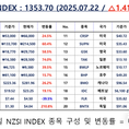 언론 통합 플랫폼이자 인터넷신문사 제보팀장을 운영 중인 더에이아이미디어는 7월 22일 NZSI INDEX 기반 시황 보고서를 발표했다. [편집자주] NZSI INDEX는 왜곡된 시장 정보에서 벗어나, 개인 투자자를 위한 공정하고 실질적인 투자 기준을 제시합니다. NZSI INDEX에는 미래를 설계할 수 있는 자본시장의 가능성이 담겨 있습니다. ★ 지수변경 : 1,000을 기준으로 종목 기여도 동일 반영 ★ 기 준 가 : 2024. 12. 20 / 1차 개편 : 2025. 04. 01 ★ 평가기준 : 20개 종목 X 5개 항목 (건전성, 안전성, 성장성, 위험도, 기대값) X 10등급 (A3 ~ D) 2025년 7월 22일, 코스피 지수는 전 거래일 대비 1.27% 내린 3,169.94포인트로 마감됐고, 코스닥 지수는 1.06% 하락한 812.97포인트를 기록했다. 이날 코스피 시장의 거래대금은 약 10조 9천억 원, 코스닥 시장은 약 6조 9천억 원 수준을 보이며 전일과 유사한 유동성을 유지했다. 시가총액은 코스피가 2,582조 원, 코스닥이 416조 원으로 각각 집계됐다. 글로벌 금융시장에서 미국 뉴욕 증시는 혼조세로 마감됐다. 다우존스 산업평균지수는 견조
