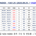 언론 통합 플랫폼이자 인터넷신문사 제보팀장을 운영 중인 더에이아이미디어는 9월 25일 NZSI INDEX 기반 시황 보고서를 발표했다. [편집자주] NZSI INDEX는 왜곡된 시장 정보에서 벗어나, 개인 투자자를 위한 공정하고 실질적인 투자 기준을 제시합니다. NZSI INDEX에는 미래를 설계할 수 있는 자본시장의 가능성이 담겨 있습니다. ★ 지수변경 : 1,000을 기준으로 종목 기여도 동일 반영 ★ 기 준 가 : 2024. 12. 20 / 1차 개편 : 2025. 04. 01 ★ 평가기준 : 20개 종목 X 5개 항목 (건전성, 안전성, 성장성, 위험도, 기대값) X 10등급 (A3 ~ D) 2025년 9월 25일, 국내 증시는 소폭 하락 마감했다. 코스피 지수는 전 거래일 대비 0.03% 내린 3,472.11포인트를 기록했고, 코스닥 지수는 0.98% 하락한 852.48포인트로 장을 마쳤다. 거래대금은 코스피 약 11조 원, 코스닥 약 6조 7천억 원 수준으로 전일과 유사한 수준을 보였으며, 시가총액은 코스피 2,840조 1천억 원, 코스닥 443조 1천억 원으로 집계됐다. 글로벌 시장도 하락 흐름을 보였다. 미국 뉴욕 증시에서 다우존스 산업평균지수