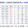 언론 통합 플랫폼이자 인터넷신문사 제보팀장을 운영 중인 더에이아이미디어는 9월 26일 NZSI INDEX 기반 시황 보고서를 발표했다. [편집자주] NZSI INDEX는 왜곡된 시장 정보에서 벗어나, 개인 투자자를 위한 공정하고 실질적인 투자 기준을 제시합니다. NZSI INDEX에는 미래를 설계할 수 있는 자본시장의 가능성이 담겨 있습니다. ★ 지수변경 : 1,000을 기준으로 종목 기여도 동일 반영 ★ 기 준 가 : 2024. 12. 20 / 1차 개편 : 2025. 04. 01 ★ 평가기준 : 20개 종목 X 5개 항목 (건전성, 안전성, 성장성, 위험도, 기대값) X 10등급 (A3 ~ D) 2025년 9월 26일, 국내 증시 코스피 지수는 전 거래일 대비 2.45% 내린 3,386.05포인트를 기록했고, 코스닥 지수는 2.03% 하락한 835.19포인트로 장을 마쳤다. 거래대금은 코스피 약 11조 원, 코스닥 약 6조 7천억 원 수준으로 전일 대비 소폭 확대되었으며, 시가총액은 코스피 2,770조 1천억 원, 코스닥 434조 2천억 원으로 집계됐다. 글로벌 시장 미국 뉴욕 증시에서 다우존스 산업평균지수는 0.65% 오른 46,247.29포인트, 나스