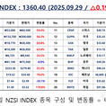언론 통합 플랫폼이자 인터넷신문사 제보팀장을 운영 중인 더에이아이미디어는 9월 29일 NZSI INDEX 기반 시황 보고서를 발표했다. [편집자주] NZSI INDEX는 왜곡된 시장 정보에서 벗어나, 개인 투자자를 위한 공정하고 실질적인 투자 기준을 제시합니다. NZSI INDEX에는 미래를 설계할 수 있는 자본시장의 가능성이 담겨 있습니다. ★ 지수변경 : 1,000을 기준으로 종목 기여도 동일 반영 ★ 기 준 가 : 2024. 12. 20 / 1차 개편 : 2025. 04. 01 ★ 평가기준 : 20개 종목 X 5개 항목 (건전성, 안전성, 성장성, 위험도, 기대값) X 10등급 (A3 ~ D) 2025년 9월 29일, 국내 증시는 반등 흐름을 보이며 하락 구간에서 탈출하는 조짐을 보였다. 코스피 지수는 전 거래일 대비 1.33% 오른 3,431.21포인트로 마감했고, 코스닥 지수도 1.38% 상승한 846.71포인트로 장을 마쳤다. 거래대금은 코스피 약 11조 원, 코스닥 약 6조 7천억 원 수준으로 전일과 유사한 흐름을 보였고, 시가총액은 코스피 2,807조 5천억 원, 코스닥 440조 1천억 원으로 집계됐다. 상승 종목이 많아졌고, 중·소형주 중심