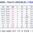 언론 통합 플랫폼이자 인터넷신문사 제보팀장을 운영 중인 더에이아이미디어는 9월 30일 NZSI INDEX 기반 시황 보고서를 발표했다. [편집자주] NZSI INDEX는 왜곡된 시장 정보에서 벗어나, 개인 투자자를 위한 공정하고 실질적인 투자 기준을 제시합니다. NZSI INDEX에는 미래를 설계할 수 있는 자본시장의 가능성이 담겨 있습니다. ★ 지수변경 : 1,000을 기준으로 종목 기여도 동일 반영 ★ 기 준 가 : 2024. 12. 20 / 1차 개편 : 2025. 04. 01 ★ 평가기준 : 20개 종목 X 5개 항목 (건전성, 안전성, 성장성, 위험도, 기대값) X 10등급 (A3 ~ D) 2025년 9월 30일, 국내 증시 코스피 지수는 전 거래일 대비 0.19% 내린 3,424.60포인트로 마감했고, 코스닥 지수도 0.56% 하락한 841.99포인트로 장을 마쳤다. 거래대금은 코스피 약 11조 원, 코스닥 약 6조 7천억 원 수준으로 전일과 유사한 흐름을 보였고, 시가총액은 코스피 2,800조 3천억 원, 코스닥 437조 7천억 원으로 집계됐다. 상승 종목이 많아졌고, 중·소형주 중심 매수 흐름이 복귀한 모습도 확인된다. 글로벌 시장 미국 뉴욕