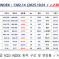 언론 통합 플랫폼이자 인터넷신문사 제보팀장을 운영 중인 더에이아이미디어는 10월 1일 NZSI INDEX 기반 시황 보고서를 발표했다. [편집자주] NZSI INDEX는 왜곡된 시장 정보에서 벗어나, 개인 투자자를 위한 공정하고 실질적인 투자 기준을 제시합니다. NZSI INDEX에는 미래를 설계할 수 있는 자본시장의 가능성이 담겨 있습니다. ★ 지수변경 : 1,000을 기준으로 종목 기여도 동일 반영 ★ 기 준 가 : 2024. 12. 20 / 1차 개편 : 2025. 04. 01 ★ 평가기준 : 20개 종목 X 5개 항목 (건전성, 안전성, 성장성, 위험도, 기대값) X 10등급 (A3 ~ D) 2025년 10월 1일, 국내 증시는 반등 흐름을 이어갔다. 코스피 지수는 전 거래일 대비 0.91% 상승한 3,455.83포인트로 마감했고, 코스닥 지수는 0.40% 오른 845.34포인트로 장을 마쳤다. 거래대금은 코스피 약 11조 원, 코스닥 약 6조 7천억 원 수준으로 전일과 유사한 흐름이었고, 시가총액은 코스피 2,828조 원, 코스닥 439조 5천억 원으로 집계되었다. 글로벌 시장에서도 양호한 흐름이 이어졌다. 미국 뉴욕 증시에서는 다우존스 산업평균지수