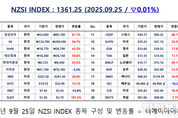 언론 통합 플랫폼이자 인터넷신문사 제보팀장을 운영 중인 더에이아이미디어는 9월 25일 NZSI INDEX 기반 시황 보고서를 발표했다. [편집자주] NZSI INDEX는 왜곡된 시장 정보에서 벗어나, 개인 투자자를 위한 공정하고 실질적인 투자 기준을 제시합니다. NZSI INDEX에는 미래를 설계할 수 있는 자본시장의 가능성이 담겨 있습니다. ★ 지수변경 : 1,000을 기준으로 종목 기여도 동일 반영 ★ 기 준 가 : 2024. 12. 20 / 1차 개편 : 2025. 04. 01 ★ 평가기준 : 20개 종목 X 5개 항목 (건전성, 안전성, 성장성, 위험도, 기대값) X 10등급 (A3 ~ D) 2025년 9월 25일, 국내 증시는 소폭 하락 마감했다. 코스피 지수는 전 거래일 대비 0.03% 내린 3,472.11포인트를 기록했고, 코스닥 지수는 0.98% 하락한 852.48포인트로 장을 마쳤다. 거래대금은 코스피 약 11조 원, 코스닥 약 6조 7천억 원 수준으로 전일과 유사한 수준을 보였으며, 시가총액은 코스피 2,840조 1천억 원, 코스닥 443조 1천억 원으로 집계됐다. 글로벌 시장도 하락 흐름을 보였다. 미국 뉴욕 증시에서 다우존스 산업평균지수
