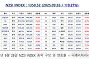 언론 통합 플랫폼이자 인터넷신문사 제보팀장을 운영 중인 더에이아이미디어는 9월 26일 NZSI INDEX 기반 시황 보고서를 발표했다. [편집자주] NZSI INDEX는 왜곡된 시장 정보에서 벗어나, 개인 투자자를 위한 공정하고 실질적인 투자 기준을 제시합니다. NZSI INDEX에는 미래를 설계할 수 있는 자본시장의 가능성이 담겨 있습니다. ★ 지수변경 : 1,000을 기준으로 종목 기여도 동일 반영 ★ 기 준 가 : 2024. 12. 20 / 1차 개편 : 2025. 04. 01 ★ 평가기준 : 20개 종목 X 5개 항목 (건전성, 안전성, 성장성, 위험도, 기대값) X 10등급 (A3 ~ D) 2025년 9월 26일, 국내 증시 코스피 지수는 전 거래일 대비 2.45% 내린 3,386.05포인트를 기록했고, 코스닥 지수는 2.03% 하락한 835.19포인트로 장을 마쳤다. 거래대금은 코스피 약 11조 원, 코스닥 약 6조 7천억 원 수준으로 전일 대비 소폭 확대되었으며, 시가총액은 코스피 2,770조 1천억 원, 코스닥 434조 2천억 원으로 집계됐다. 글로벌 시장 미국 뉴욕 증시에서 다우존스 산업평균지수는 0.65% 오른 46,247.29포인트, 나스