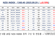 언론 통합 플랫폼이자 인터넷신문사 제보팀장을 운영 중인 더에이아이미디어는 9월 29일 NZSI INDEX 기반 시황 보고서를 발표했다. [편집자주] NZSI INDEX는 왜곡된 시장 정보에서 벗어나, 개인 투자자를 위한 공정하고 실질적인 투자 기준을 제시합니다. NZSI INDEX에는 미래를 설계할 수 있는 자본시장의 가능성이 담겨 있습니다. ★ 지수변경 : 1,000을 기준으로 종목 기여도 동일 반영 ★ 기 준 가 : 2024. 12. 20 / 1차 개편 : 2025. 04. 01 ★ 평가기준 : 20개 종목 X 5개 항목 (건전성, 안전성, 성장성, 위험도, 기대값) X 10등급 (A3 ~ D) 2025년 9월 29일, 국내 증시는 반등 흐름을 보이며 하락 구간에서 탈출하는 조짐을 보였다. 코스피 지수는 전 거래일 대비 1.33% 오른 3,431.21포인트로 마감했고, 코스닥 지수도 1.38% 상승한 846.71포인트로 장을 마쳤다. 거래대금은 코스피 약 11조 원, 코스닥 약 6조 7천억 원 수준으로 전일과 유사한 흐름을 보였고, 시가총액은 코스피 2,807조 5천억 원, 코스닥 440조 1천억 원으로 집계됐다. 상승 종목이 많아졌고, 중·소형주 중심