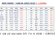 언론 통합 플랫폼이자 인터넷신문사 제보팀장을 운영 중인 더에이아이미디어는 10월 2일 NZSI INDEX 기반 시황 보고서를 발표했다. [편집자주] NZSI INDEX는 왜곡된 시장 정보에서 벗어나, 개인 투자자를 위한 공정하고 실질적인 투자 기준을 제시합니다. NZSI INDEX에는 미래를 설계할 수 있는 자본시장의 가능성이 담겨 있습니다. ★ 지수변경 : 1,000을 기준으로 종목 기여도 동일 반영 ★ 기 준 가 : 2024. 12. 20 / 1차 개편 : 2025. 04. 01 ★ 평가기준 : 20개 종목 X 5개 항목 (건전성, 안전성, 성장성, 위험도, 기대값) X 10등급 (A3 ~ D) 2025년 10월 2일, 국내 증시는 강한 상승 흐름을 보였다. 코스피 지수는 전 거래일 대비 2.70% 상승한 3,549.21포인트로 마감했고, 코스닥 지수도 1.05% 오른 854.25포인트를 기록했다. 거래대금은 코스피 약 11조 1천억 원, 코스닥 약 6조 7천억 원 수준으로 전일 대비 증가했으며, 시가총액은 코스피 2,904조 7천억 원, 코스닥 444조 2천억 원으로 집계됐다. 미국 뉴욕 증시에서도 대체로 우호적 흐름이 이어졌다. 다우존스 산업평균지수는