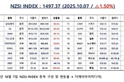 언론 통합 플랫폼이자 인터넷신문사 제보팀장을 운영 중인 더에이아이미디어는 10월 7일 NZSI INDEX 기반 시황 보고서를 발표했다. [편집자주] NZSI INDEX는 왜곡된 시장 정보에서 벗어나, 개인 투자자를 위한 공정하고 실질적인 투자 기준을 제시합니다. NZSI INDEX에는 미래를 설계할 수 있는 자본시장의 가능성이 담겨 있습니다. ★ 지수변경 : 1,000을 기준으로 종목 기여도 동일 반영 ★ 기 준 가 : 2024. 12. 20 / 1차 개편 : 2025. 04. 01 ★ 평가기준 : 20개 종목 X 5개 항목 (건전성, 안전성, 성장성, 위험도, 기대값) X 10등급 (A3 ~ D) 2025년 10월 7일은 추석 연휴로 국내 증시는 휴장했다. 미국 뉴욕 증시는 하락 흐름을 보였다. 다우존스 산업평균지수는 0.20% 하락해 46,602.98포인트로 마감했고, 기술주 중심의 나스닥 종합지수는 0.67% 내린 22,788.36포인트를 기록했다. 공정 투자 기준형 지수 NZSI INDEX는 이날 1.50% 오른 1,497.37포인트를 기록하며 5거래일 연속 상승 흐름을 이어갔다. 이 지수는 한국과 글로벌 대표 종목의 실질 수익률을 반영해, 전통적 시