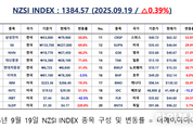 언론 통합 플랫폼이자 인터넷신문사 제보팀장을 운영 중인 더에이아이미디어는 9월 19일 NZSI INDEX 기반 시황 보고서를 발표했다. [편집자주] NZSI INDEX는 왜곡된 시장 정보에서 벗어나, 개인 투자자를 위한 공정하고 실질적인 투자 기준을 제시합니다. NZSI INDEX에는 미래를 설계할 수 있는 자본시장의 가능성이 담겨 있습니다. ★ 지수변경 : 1,000을 기준으로 종목 기여도 동일 반영 ★ 기 준 가 : 2024. 12. 20 / 1차 개편 : 2025. 04. 01 ★ 평가기준 : 20개 종목 X 5개 항목 (건전성, 안전성, 성장성, 위험도, 기대값) X 10등급 (A3 ~ D) 국내 증시는 혼조세 속에서도 코스닥이 반등하고 코스피는 소폭 약세로 마감했다. 코스피는 전날 대비 0.46% 하락한 3,445.24포인트를 기록했고, 코스닥은 0.70% 상승한 863.11포인트로 장을 마쳤다. 거래대금은 코스피 약 11조 원, 코스닥 약 6조 6천억 원 수준으로 전일 대비 다소 증가했고, 시가총액은 코스피 2,816조 9천억 원, 코스닥 448조 2천억 원로 집계됐다. 뉴욕 증시에서는 강세 흐름이 이어졌다. 다우존스 산업평균지수는 0.37% 상승