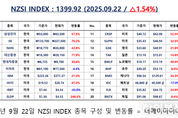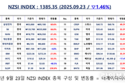 언론 통합 플랫폼이자 인터넷신문사 제보팀장을 운영 중인 더에이아이미디어는 9월 23일 NZSI INDEX 기반 시황 보고서를 발표했다. [편집자주] NZSI INDEX는 왜곡된 시장 정보에서 벗어나, 개인 투자자를 위한 공정하고 실질적인 투자 기준을 제시합니다. NZSI INDEX에는 미래를 설계할 수 있는 자본시장의 가능성이 담겨 있습니다. ★ 지수변경 : 1,000을 기준으로 종목 기여도 동일 반영 ★ 기 준 가 : 2024. 12. 20 / 1차 개편 : 2025. 04. 01 ★ 평가기준 : 20개 종목 X 5개 항목 (건전성, 안전성, 성장성, 위험도, 기대값) X 10등급 (A3 ~ D) 2025년 9월 23일, 국내 증시는 혼조세를 보였다. 코스피는 전 거래일 대비 0.51% 상승한 3,486.19포인트로 마감했지만, 코스닥은0.25% 하락한 872.21포인트로 장을 마쳤다. 거래대금은 코스피 약 11조 원, 코스닥 약 6조 7천억 원 수준으로 전일 대비 소폭 확대되었고, 시가총액은 코스피 2,852조 4천억 원, 코스닥 453조 1천억 원으로 집계되었다. 글로벌 시장에서는 다우존스 산업평균지수가 0.19% 하락한 46,292.78포인트로, 나스