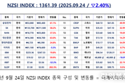 언론 통합 플랫폼이자 인터넷신문사 제보팀장을 운영 중인 더에이아이미디어는 9월 24일 NZSI INDEX 기반 시황 보고서를 발표했다. [편집자주] NZSI INDEX는 왜곡된 시장 정보에서 벗어나, 개인 투자자를 위한 공정하고 실질적인 투자 기준을 제시합니다. NZSI INDEX에는 미래를 설계할 수 있는 자본시장의 가능성이 담겨 있습니다. ★ 지수변경 : 1,000을 기준으로 종목 기여도 동일 반영 ★ 기 준 가 : 2024. 12. 20 / 1차 개편 : 2025. 04. 01 ★ 평가기준 : 20개 종목 X 5개 항목 (건전성, 안전성, 성장성, 위험도, 기대값) X 10등급 (A3 ~ D) 2025년 9월 24일, 국내 증시는 하락세로 전환되었다. 코스피 지수는 전 거래일 대비 0.40% 내린 3,472.14포인트를 기록했고, 코스닥 지수는 1.29% 하락한 860.94포인트로 장을 마감했다. 거래대금은 코스피 약 11조 원, 코스닥 약 6조 7천억 원 수준으로 전일과 유사한 수준을 보였고, 시가총액은 코스피 2,841조 원, 코스닥 447조 5천억 원으로 집계되었다. 글로벌 시장에서도 동반 약세 흐름이 계속됐다. 미국 뉴욕 증시에서 다우존스 산업평