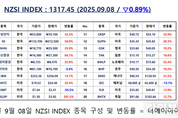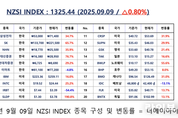 언론 통합 플랫폼이자 인터넷신문사 제보팀장을 운영 중인 더에이아이미디어는 9월 8일 NZSI INDEX 기반 시황 보고서를 발표했다. [편집자주] NZSI INDEX는 왜곡된 시장 정보에서 벗어나, 개인 투자자를 위한 공정하고 실질적인 투자 기준을 제시합니다. NZSI INDEX에는 미래를 설계할 수 있는 자본시장의 가능성이 담겨 있습니다. ★ 지수변경 : 1,000을 기준으로 종목 기여도 동일 반영 ★ 기 준 가 : 2024. 12. 20 / 1차 개편 : 2025. 04. 01 ★ 평가기준 : 20개 종목 X 5개 항목 (건전성, 안전성, 성장성, 위험도, 기대값) X 10등급 (A3 ~ D) 2025년 9월 8일, 국내 증시는 5거래일 연속 상승세를 이어갔다. 코스피 지수는 전 거래일 대비 0.45% 오른 3,219.59포인트로 마감했고, 코스닥 지수는 0.89% 상승한 818.60포인트를 기록하며 동반 강세를 보였다. 거래대금은 코스피 약 10조 9천억 원, 코스닥 약 6조6천억 원으로 전일과 큰 차이는 없었고, 시가총액은 코스피 2,631조 3천억 원, 코스닥 424조 5천억 원으로 나타났다. 해외 증시는 연방준비제도의 금리 인하 기대감에 힘입어 안
