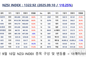 언론 통합 플랫폼이자 인터넷신문사 제보팀장을 운영 중인 더에이아이미디어는 9월 10일 NZSI INDEX 기반 시황 보고서를 발표했다. [편집자주] NZSI INDEX는 왜곡된 시장 정보에서 벗어나, 개인 투자자를 위한 공정하고 실질적인 투자 기준을 제시합니다. NZSI INDEX에는 미래를 설계할 수 있는 자본시장의 가능성이 담겨 있습니다. ★ 지수변경 : 1,000을 기준으로 종목 기여도 동일 반영 ★ 기 준 가 : 2024. 12. 20 / 1차 개편 : 2025. 04. 01 ★ 평가기준 : 20개 종목 X 5개 항목 (건전성, 안전성, 성장성, 위험도, 기대값) X 10등급 (A3 ~ D) 2025년 9월 10일, 국내 증시는 7거래일 연속 상승세를 이어갔다. 코스피 지수는 전 거래일 대비 1.67% 상승한 3,314.53포인트로 마감했고, 코스닥 지수는 0.99% 오른 833.00포인트를 기록했다. 거래대금은 코스피 약 10조 9천억 원, 코스닥 약 6조 6천억 원으로 전일과 유사한 수준을 유지했으며, 시가총액은 코스피 2,709조 2천억 원, 코스닥 432조 1천억 원으로 나타났다. 대형주 중심의 매수세가 뚜렷했고, 기관과 외국인의 순매수가 지수