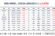 언론 통합 플랫폼이자 인터넷신문사 제보팀장을 운영 중인 더에이아이미디어는 9월 11일 NZSI INDEX 기반 시황 보고서를 발표했다. [편집자주] NZSI INDEX는 왜곡된 시장 정보에서 벗어나, 개인 투자자를 위한 공정하고 실질적인 투자 기준을 제시합니다. NZSI INDEX에는 미래를 설계할 수 있는 자본시장의 가능성이 담겨 있습니다. ★ 지수변경 : 1,000을 기준으로 종목 기여도 동일 반영 ★ 기 준 가 : 2024. 12. 20 / 1차 개편 : 2025. 04. 01 ★ 평가기준 : 20개 종목 X 5개 항목 (건전성, 안전성, 성장성, 위험도, 기대값) X 10등급 (A3 ~ D) 2025년 9월 11일, 국내 증시는 8거래일 연속 상승세를 이어갔다. 코스피 지수는 전 거래일 대비 0.90% 상승한 3,344.20포인트로 마감했고, 코스닥 지수는 021% 오른 834.76포인트를 기록했다. 거래대금은 코스피 약 10조 9천억 원, 코스닥 약 6조 6천억 원으로 전일과 유사한 수준을 유지했으며, 시가총액은 코스피 2,732조 9천억 원, 코스닥 433조 원으로 나타났다. 글로벌 증시가 사상 최고치를 향해 나아가고 있어, 한국 증시에도 상승 모