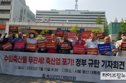 축산단체가 한목소리로 축산농가 다 죽이는 수입 축산물 무관세 조치를 즉각 철회하라고 목소리를 높였다. 축산관련단체협의회는 7월 11일 오전 9시 30분 서울 용산 전쟁기념관 앞에서 최근 정부가 추진하는 물가안정 미명의 축산물 수입 장려정책 철회를 촉구하기 위해 ‘수입축산물 무관세! 축산업 포기!’ 정부 규탄 기자회견을 개최했다. 정부는 7월 8일(금) 윤석열 대통령 주재 비상경제민생회의 개최결과, 고물가 부담경감을 위한 민생안정 방안을 발표했다. 이미 6월 22일부터 수입무관세를 적용하고 있는 돼지고기 5만톤에 대해 2만톤(삼겹살) 추가증량, 소고기(10만톤)와 닭고기(8.25만톤), 전․탈지분유(1만톤)에 대한 수입무관세 적용을 오는 7월 20일부터 연말까지 실시한다는 내용으로, 물가안정 기치아래 축산농민들의 생존권은 도외시하고 있다. 세계적 고물가흐름에 뾰족한 대책마련이 쉽지 않다는 정부당국자들의 고충도 이해가 안 가는 바는 아니다. 그러나 일반 공산품과 달리 쌀에 버금가는 주식의 반열에 오른 축산물에 대해 오직 물가와 가격잣대로만 맹목적 수입을 장려하는 것은 밥상물가 진정을 빌미로 한, 식량과 국민건강 주권포기 정책이다. 전 정권과 다르지 않게 사료값폭