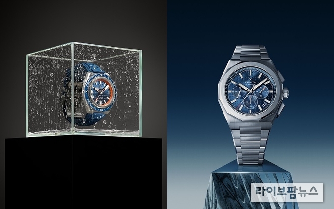 팝업을 통해 선보이는 제니스만의 특징이 고스란히 담긴 새로운 다이버 워치 ‘데피 익스트림 다이버 컬렉션’은 1969년부터 지금까지 오랜 역사를 이어온 데피 다이버 시계에서 영감을 받아 탄생한 새로운 다이버 모델로, 수심이 깊은 곳에서도 뛰어난 성능을 발휘할 수 있도록 독특하고 정교한 디자인으로 완성되었다. 또한 슈퍼 루미노바를 채운 블랙 세라믹 단방향 회전 베젤과 별들이 수놓인 하늘 패턴이 장식된 다이얼이 돋보인다. 이와 함께 선보이는 ‘데피 스카이라인 크로노그래프’는 메탈릭 블랙, 블루, 실버 컬러로 출시되어 건축적이고 기하학적이며 정교한 각면 처리가 돋보이고, 다면 베젤을 갖춘 데피의 팔각형 케이스를 모던하게 재해석한 디자인과 견고함, 강인한 내구성을 통해 세련되고 현대적인 미학과 비율을 자랑한다.