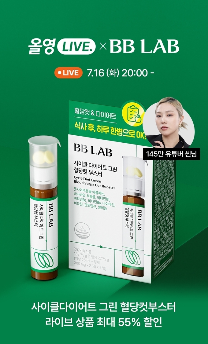 라이브 방송에서는 유튜버 씬님이 직접 출연해 ‘사이클 다이어트’ 제품 섭취 후기와 활용 루틴을 공유한다. ‘사이클 다이어트 그린 혈당컷 부스터’를 비롯해 비비랩의 인기 제품을 최대 55%까지 특가로 판매한다.
