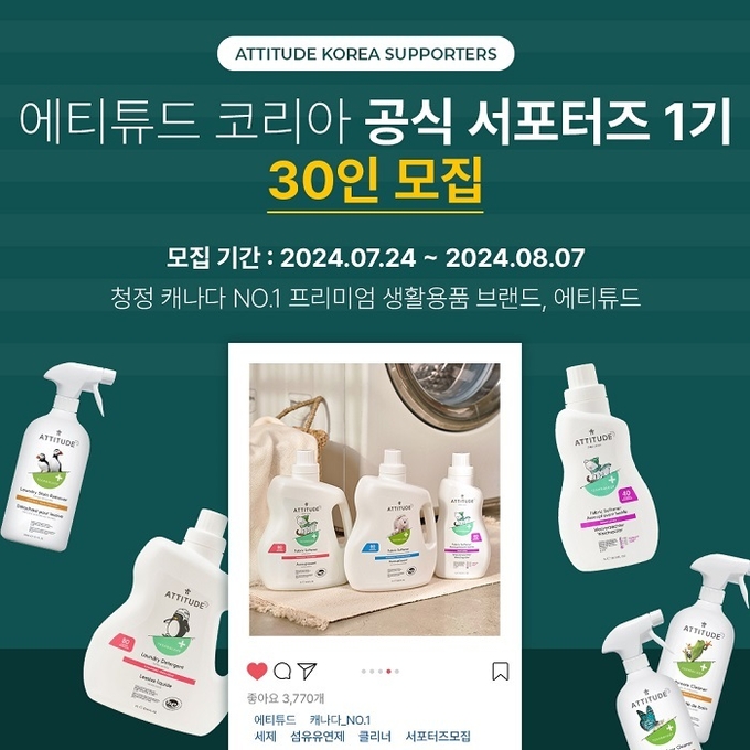 프리미엄 세탁세제 및 생활용품 브랜드 에티튜드가 오는 7월 24일부터 8월 7일까지 공식 서포터즈 1기 30명을 모집한다고 밝혔다.