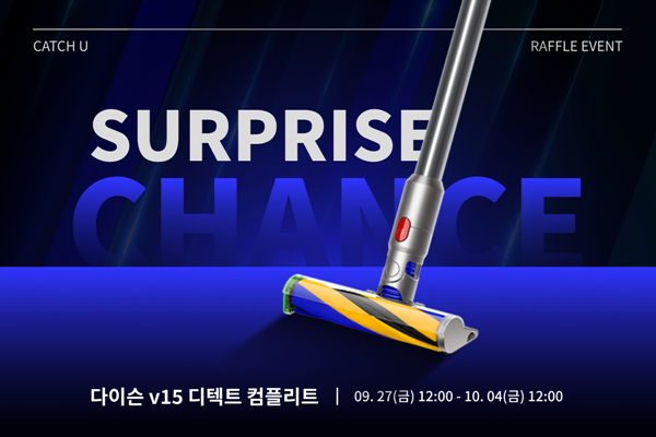 캐치유 앱에서 응모하는 고객에게 다이슨 V15 디렉트 컴플리트(옐로/니켈)를 제공한다. 당첨자는 10월 4일 금요일 12시에 발표되며, 당첨자에게는 개별 통보된다.