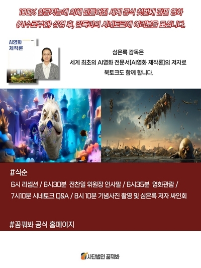 이번 <AI 수로부인> 상영과 시네토크, Q&A는 따라서 『AI 영화제작론』 북토크를 겸하며, 저자의 현장 사인회도 있을 예정이다. 참가비는 1만 원이나 가변적이다. 참가 신청은 사전에 별도로 하지 않아도, 현장에서 할 수 있다.