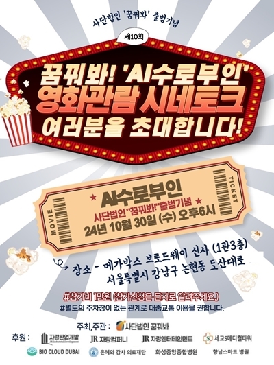 ‘사단법인 꿈꿔봐’(제임스 진 이사장, 전찬일 위원장, 송미선 부위원장)가 정식 출범을 기념해, 30일 오후 6시부터 메가박스 브로드웨이 신사 3관에서 아주 특별한 영화 이벤트를 선보인다.