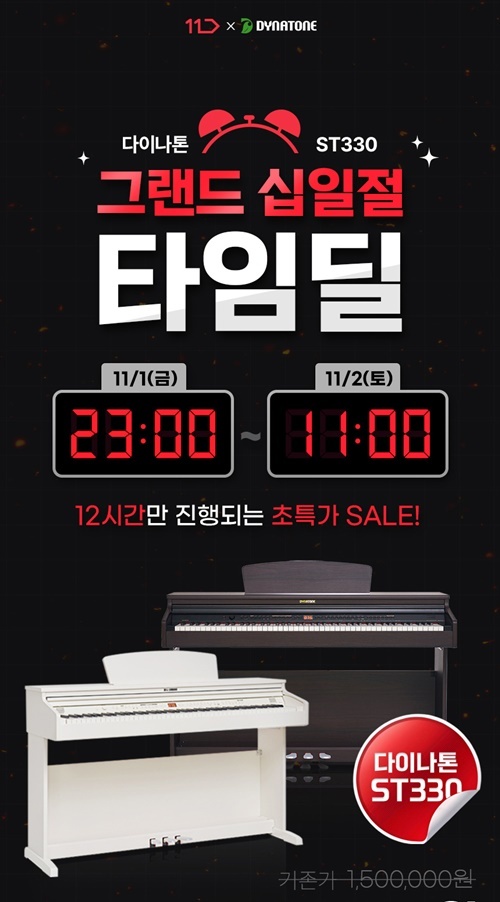 이번 행사는 11번가와 제휴하여 특별 기획된 타임딜 행사로 최신형 프리미엄 전자피아노 ST330을 특별 할인가로 만나볼 수 있다. 국산 전자피아노 전문 브랜드 다이나톤은 이번 행사를 통해 프리미엄 ST330을 파격적인 혜택가로 선보일 예정이며 그랜드 십일절을 기념하여 한정 수량에 한하여 특별한 조건으로 구성된 사은 행사를 진행 한다.