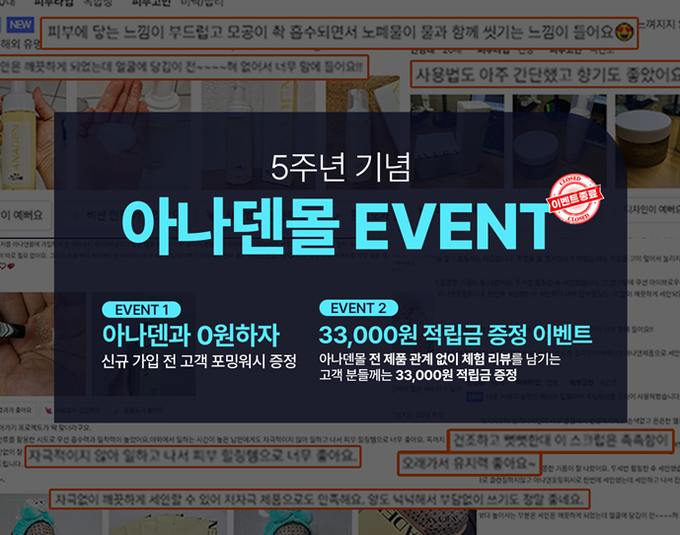 ‘33,000원 적립금 증정 이벤트’는 아나덴몰 전 제품 구매자 전원을 대상으로 했다. 아나덴몰의 전 제품을 구매한 고객은 기간 내 글자 수 30자 이상의 포토리뷰를 작성하는 것으로 참여했다. 참여 고객은 33,000원의 적립금 혜택을 받았으며, 적립금은 적립일 기준 60일 이내 다음 구매시 바로 사용 가능하다.