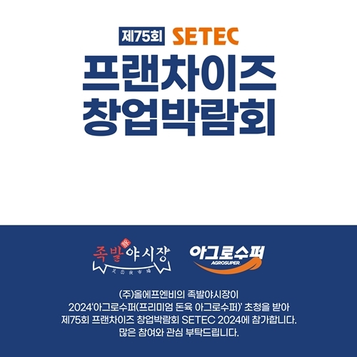'아그로수퍼(프리미엄 돈육 브랜드)' 초청세미나는 월드전람이 주관하는 '2024 제75회 프랜차이즈 창업박람회 in SETEC'는 11월 14일(목)부터 16일(토)까지 서울무역전시장'에서 열린다.