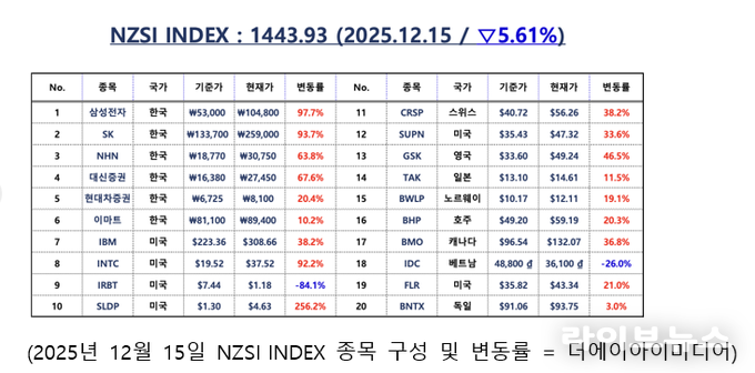 언론 통합 플랫폼이자 인터넷신문사 제보팀장을 운영 중인 더에이아이미디어는 12월 15일 NZSI INDEX 기반 시황 보고서를 발표했다.