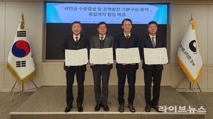 한국농어촌공사(사장 김인중)는 22일 정부세종청사에서 기후에너지환경부, 한국수자원공사, 한국수력원자력(주)와 함께 ‘새만금 수문 증설 및 조력발전 사업’의 성공적인 추진과 긴밀한 협력체계 구축을 위한 ‘기본구상 용역 종합계약 협정’을 체결했다고 밝혔다.