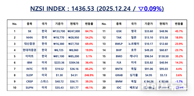 이날 NZSI INDEX는 0.09% 하락한 1,436.53포인트로 마감했다. 한국 대표 5개 종목의 누적 상승률은 48.74%(배당 포함 52.44%), 글로벌 대표 15개 종목의 누적 상승률은 41.96%(배당 포함 45.34%)로 집계됐다. 한국 시장의 장기 성과가 여전히 글로벌 시장을 앞서고는 있지만, 그 격차는 점차 축소되는 흐름이 확인됐다.