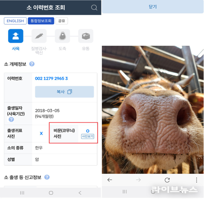 소의 코 무늬인 ‘비문’은 소의 개체식별 정확도를 획기적으로 높이는 정보로, 이번 서비스를 통해 비문 정보가 등록된 일부 개체는 우선 조회가 가능하다. ‘축산물 이력정보 앱’을 실행해 개체식별 번호를 조회하면 소 비문 사진을 ‘원터치’로 즉시 확인할 수 있다. 소 개체식별 번호 조회 시 이력 정보와 함께 해당 소의 비문 사진을 한 번에 볼 수 있게 된 셈이다.