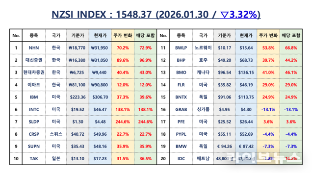 한편 NZSI INDEX는 이날 3.32% 하락한 1,548.37포인트로 조정을 받았다. 누적 성과에서는 한국 시장의 우위가 지속적으로 유지되고 있다. 한국 대표 4개 종목의 누적 상승률은 71.98%(배당 포함 75.68%), 글로벌 대표 16개 종목은 49.12%(배당 포함 52.49%)로 집계됐다.