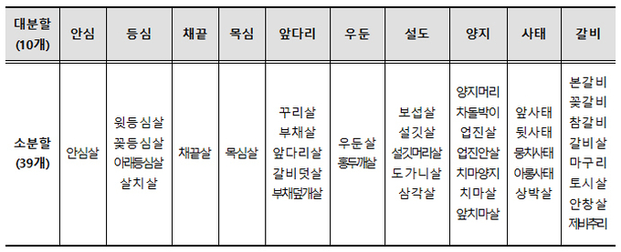 우선 한우 부위는 대분할 10개와 이를 세분화한 39개의 소분할로 나뉘고, 조리 방식에 따라 최적의 맛을 내는 부위가 각기 다르다.