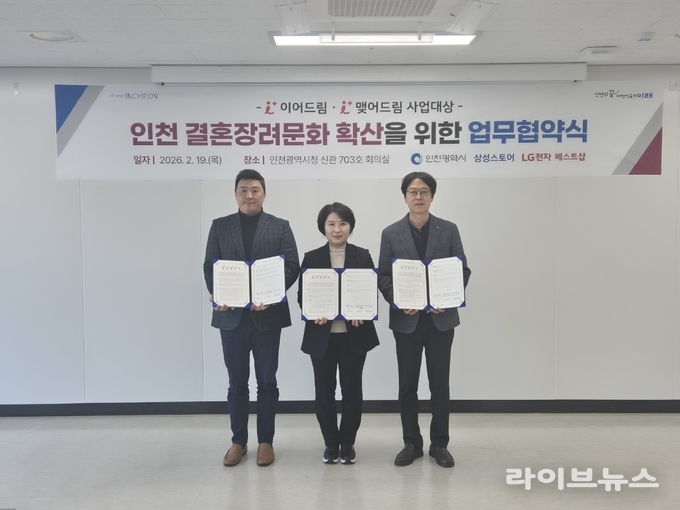 인천시는 19일 시청 신관 회의실에서 인천지역 삼성전자 삼성스토어와 LG전자 베스트샵과 결혼장려 문화 확산을 위한 민간협력 협약을 체결했다고 밝혔다.