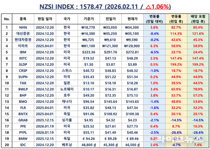 NZSI INDEX는 1.06% 상승한 1,578.47포인트를 기록하며 상승 추세를 이어갔다. 한국 대표 4개 종목은 93.59%, 배당 포함 기준 97.30% 상승했고, 글로벌 대표 16개 종목은 47.48%, 배당 포함 50.95% 상승에 그쳤다.
