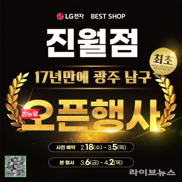 LG전자 베스트샵 진월점 관계자는 “리뉴얼 오픈을 기념한 고객 참여 행사도 함께 마련됐다. 사전 상담 예약은 2월 18일부터 3월 5일까지 진행되며, 본격적인 프로모션은 3월 6일부터 4월 2일까지 이어진다. 행사 기간 동안 매장을 방문하는 고객에게는 다양한 할인 혜택과 함께 구매 금액에 따른 사은품이 제공된다”고 설명했다.
