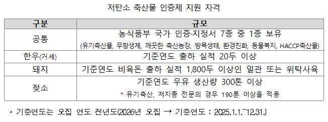 2026년도부터는 평가 제도 및 접수 면에서 개선 사항이 적용된다. 우선 비계량 평가 항목에 ‘저탄소 농업 프로그램 참여’ 여부를 반영해 참여 농장에 가산점을 부여한다. 또한, ‘저탄소 축산물 인증시스템’ 기능을 고도화해 신청 단계의 ‘사육현황보고서’ 작성을 시스템 입력으로 대체하는 등 신청 농가의 편의성을 대폭 높였다.