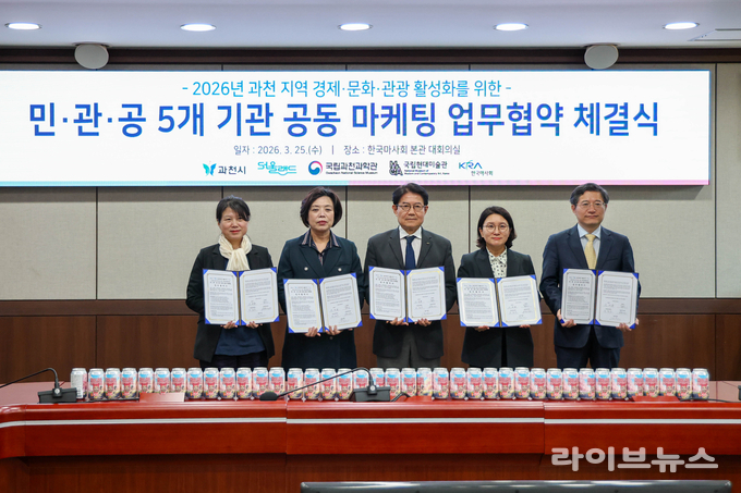 한국마사회(회장 우희종)는 과천시, 서울랜드, 국립과천과학관, 국립현대미술관과 함께 지난 25일 본관 대회의실에서 ‘2026년 과천 지역 경제·문화·관광 활성화를 위한 민·관·공 5개 기관 공동 마케팅’ 업무협약(MOU)을 체결했다.