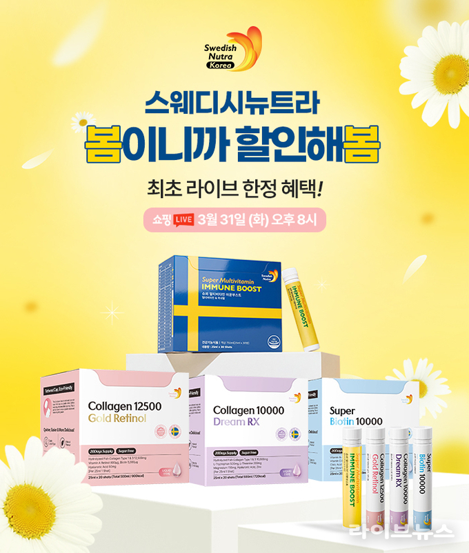 이번 라이브에서는 스웨디시뉴트라의 대표 제품 라인업도 함께 소개될 예정이다. 콜라겐 중심의 제품군을 비롯해 비오틴, 멀티비타민 등 일상 영양 관리를 위한 주요 제품이 구성돼 다양한 니즈에 맞춘 선택이 가능하도록 했다.