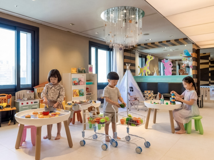 핵심 시설인 키즈 라운지는 2025년 3월 마이리틀타이거와 협업해 오픈한 70평 규모의 공간으로, 트램펄린과 볼풀이 있는 놀이 공간부터 주방 놀이와 동화책이 마련된 휴식 공간까지 총 세 구역으로 알차게 구성되었다.