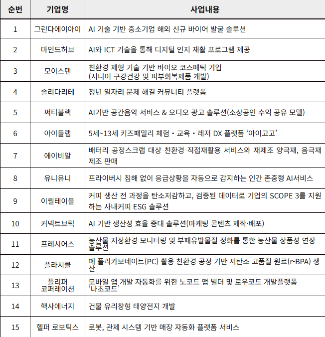 특히 올해는 신규 투자 분야인 소상공인 대상 솔루션 기업이 다수 선정됐다고 밝혔다. 공간음악 서비스와 오디오 광고를 결합한 플랫폼을 통해 매장점주에게 광고 수익을 배분하는 ‘써티블랙’, AI 이미지 생성 서비스를 통해 소상공인의 마케팅 비용 절감을 돕는 ‘커넥트브릭’, 로봇‧관제 시스템 기반 매장 자동화로 사장님들의 어려움을 해소하는 ‘헬퍼로보틱스’ 등이다.