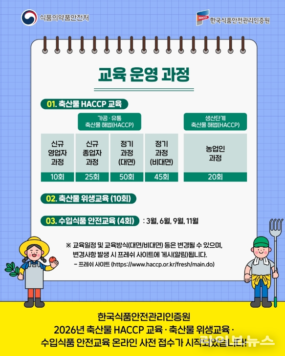 2026년 교육 세부 일정은 해썹인증원 프레쉬 누리집에서 확인할 수 있으며, 교육 신청은 연중 상시로 가능하다.