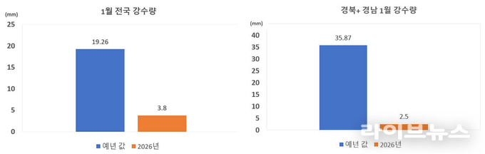 올해 1월 전국 누적 강수량은 예년 대비 19.4% 수준에 머물러 있으며, 특히 경북은 15.3%, 경남은 1.4% 수준으로 강수량이 극도로 적은 상태다. 또한 전국 상대습도는 47.2%로 예년(55.5%)보다 8.3% 낮아졌으며, 1월 부터 동해안 지역에 발효되었던 건조특보가 내륙까지 확대됨에 따라 매우 건조한 지역이 넓어지고 있다.