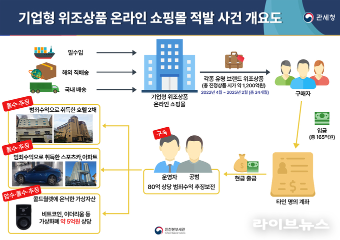 세관은 온라인 쇼핑몰 운영 실태를 추적한 뒤 위장 구매를 통해 판매 상품이 위조품임을 확인했고, 금융계좌 분석과 사업장 압수수색 등 전방위 수사를 통해 조직 전모를 밝혀냈다.