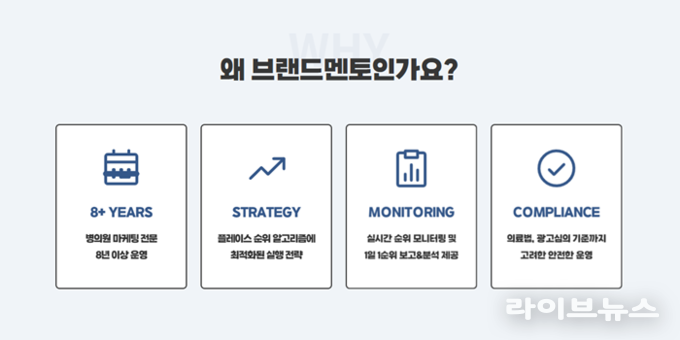 관계자는 “네이버 광고, 인스타그램 등 SNS 전략, 바이럴마케팅 등 전 채널을 아우르되, 각 실행 단계에서 왜 이 작업이 필요한가?에 대한 철저한 검증 과정을 거친다. 또한, 고객사를 안심시키기 위한 위로의 말을 하지 않는다. 대신 고객사가 보지 못하는 지점을 드러내고, 현재의 전략이 왜 실패할 수밖에 없는지 논리적으로 분해해 설명한다. 스스로를 속이는 마케팅이나 시간을 낭비하는 비효율적인 활동에 대해서는 즉각적인 중단과 방향 전환을 권고하는 것이 브랜드멘토의 원칙이다”고 전했다.