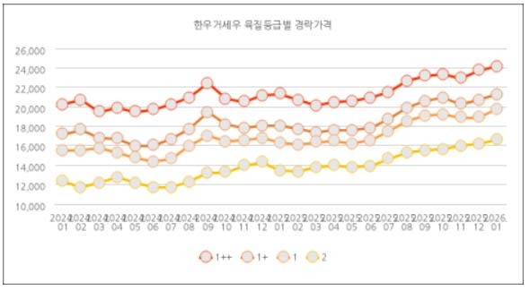 축산물 품질평가원 축산유통 통계누리 자료에 따르면 최근 한우 가격은 등급별 경락가 기준으로 꾸준한 상승세를 보이고 있다. 올해 도축두수가 90만두 미만으로 줄고 감소세는 2028년까지 이어질 것으로 전망되기 때문이다. 이에 따라 송아지 가격은 작년부터 계속 상승하여 올해는 금송아지 시대였던 2021년보다 더 높은 수준을 유지할 것으로 예상된다.