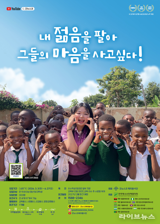 국제청소년연합은 이번 행사를 계기로 2027년 2월 파견될 26기 굿뉴스코 해외봉사단 모집을 시작했다. 굿뉴스코 해외봉사단은 “내 젊음을 팔아 그들의 마음을 사고 싶다”는 슬로건 아래 대학생들이 세계 각국에서 봉사활동을 통해 글로벌 리더십을 키우는 프로그램이다.
