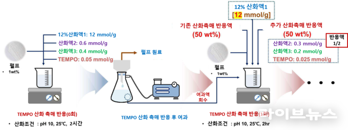 이번 기술은 CNF 제조 과정에서 사용되는 산화제를 재사용할 수 있도록 공정을 개선한 것이 핵심이다. 기존 TEMPO 산화법은 고가의 산화제를 1회 사용 후 폐기하는 구조로, 폐수 발생과 비용 증가 문제가 지속적으로 제기돼 왔다.